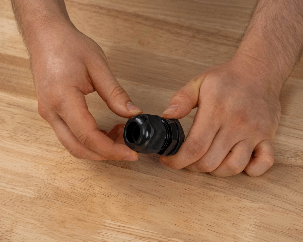 Fully seat the cable insert into the gland. The top of the seal should be flush with the top of the gland. Screw the cap nut onto the cable gland and tighten.