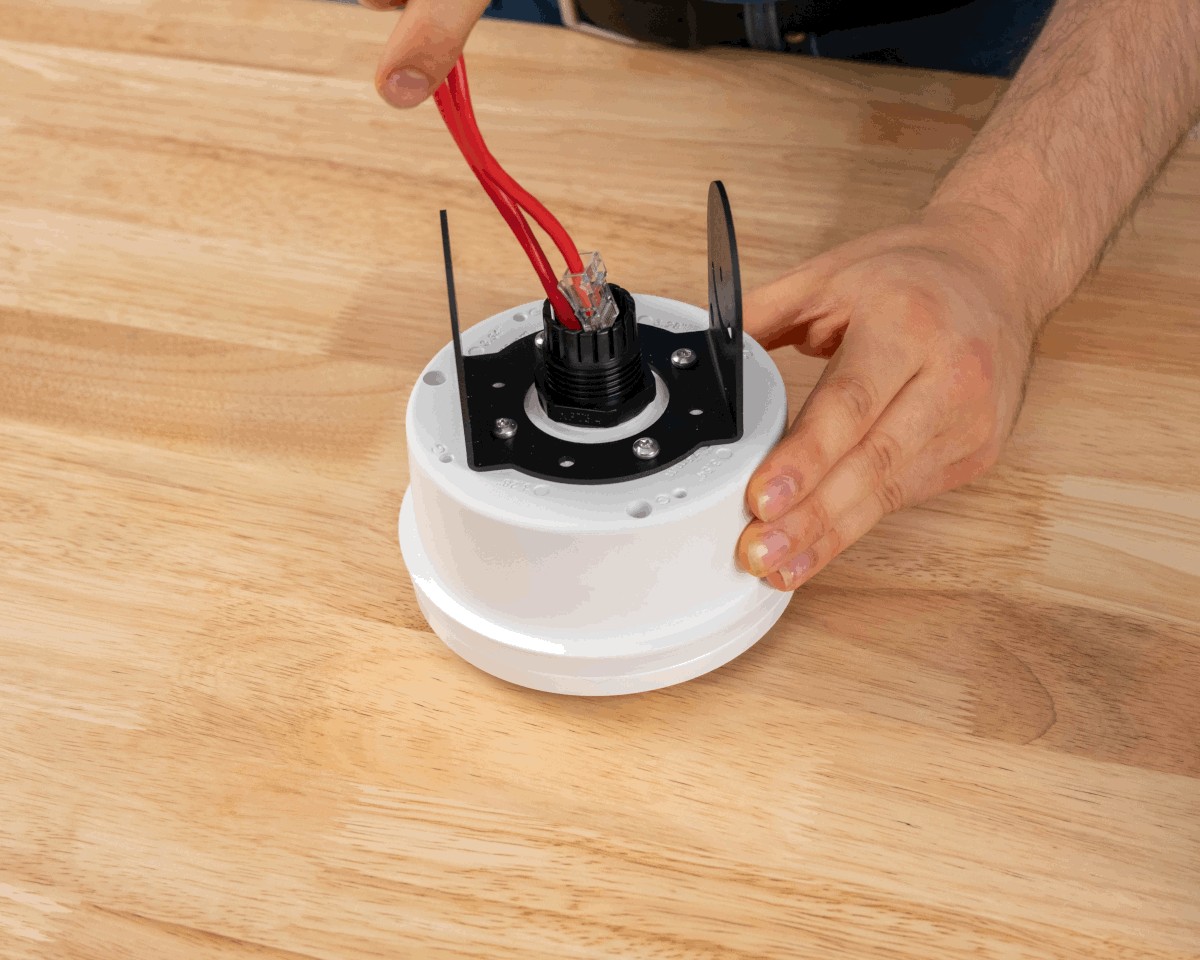 Screw the end of the cable gland to the AH302 Mounting Box. Fully seat the flat rubber gasket onto the plastic and tighten to create a seal.