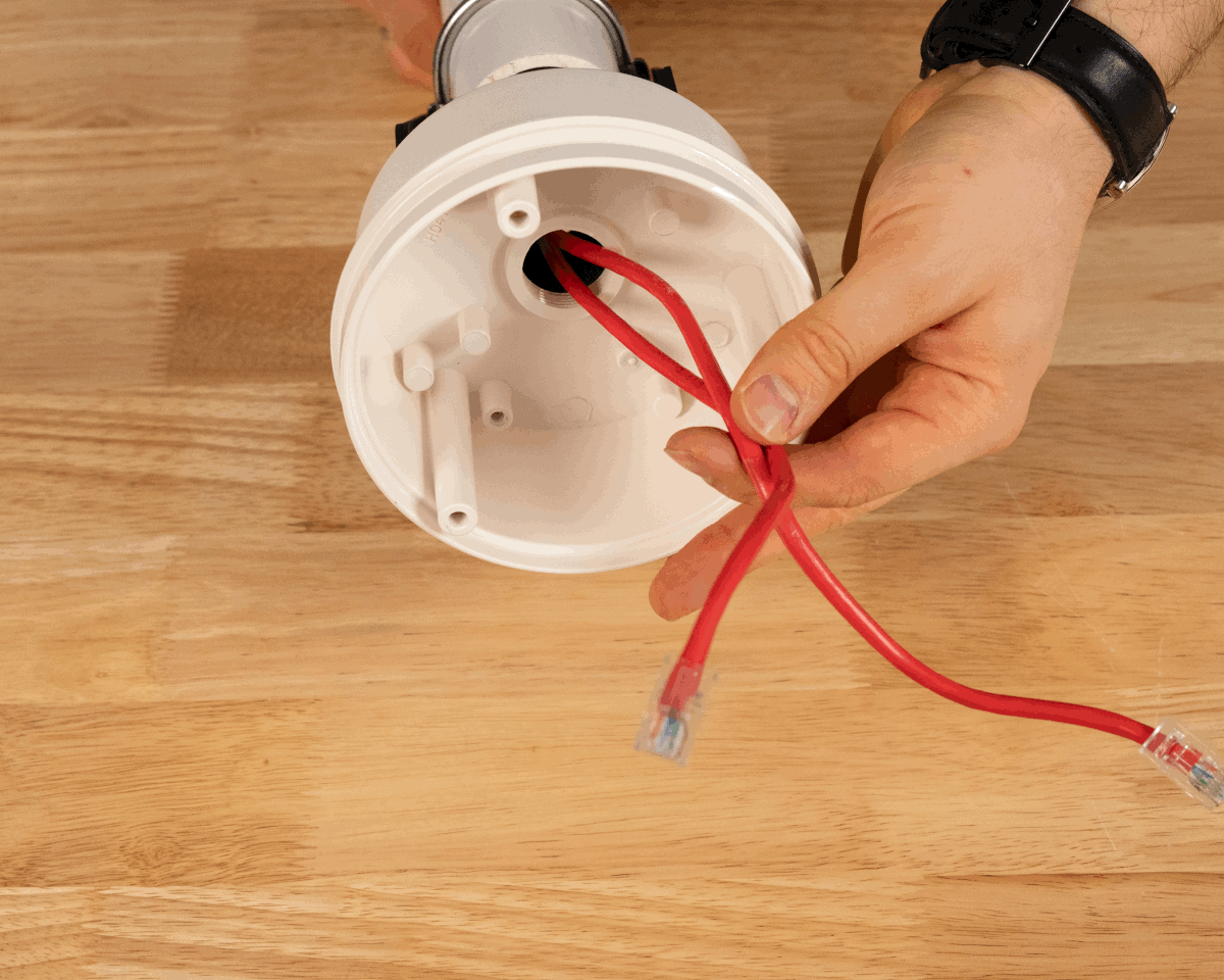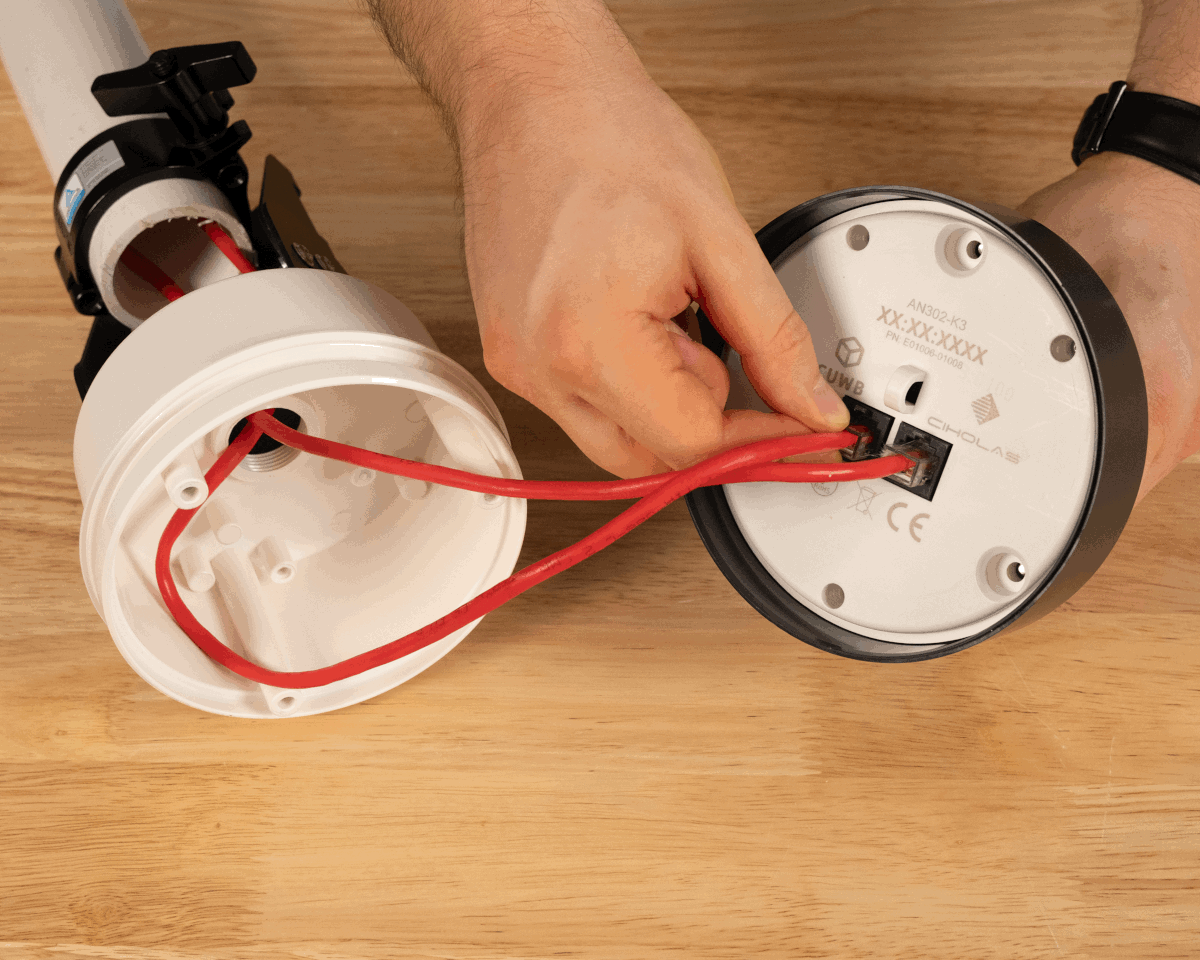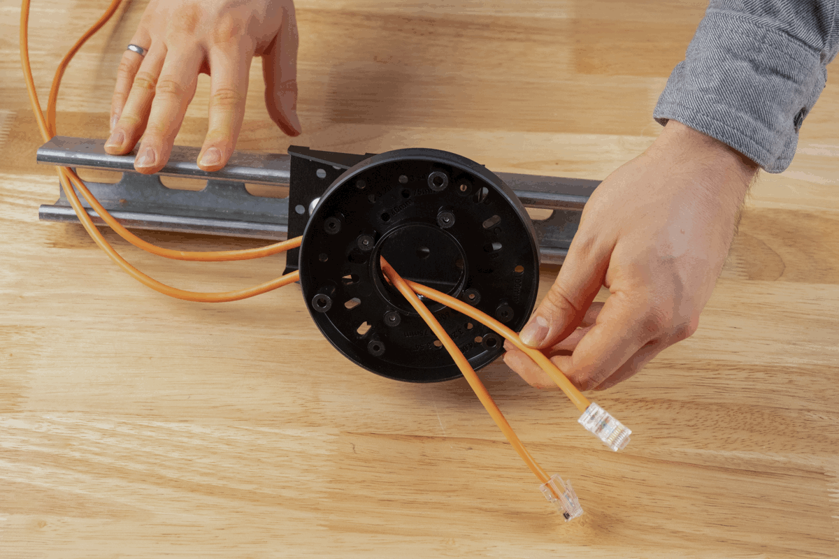 Plug the Ethernet cables into the back of the AN302 and gently insert the service loop into the mounting box.