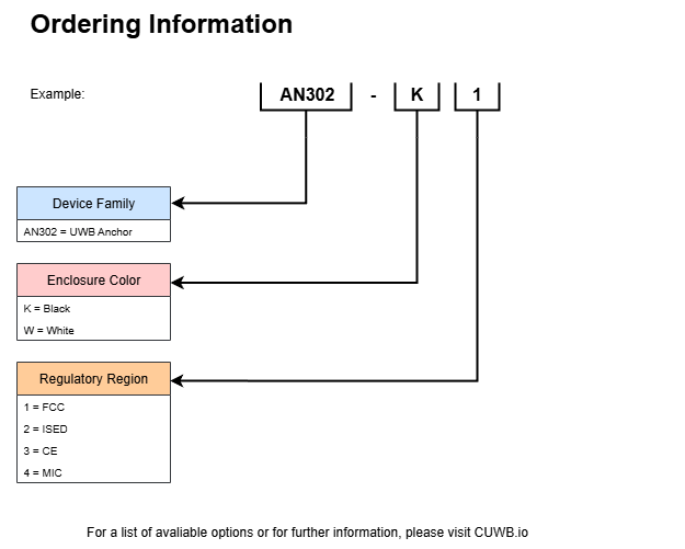 AN302 devices are region-locked at the time of purchase to comply with regulatory requirements. Please specify your intended region of operation during checkout. See regulatory compliance for supported regions and compliance statements.