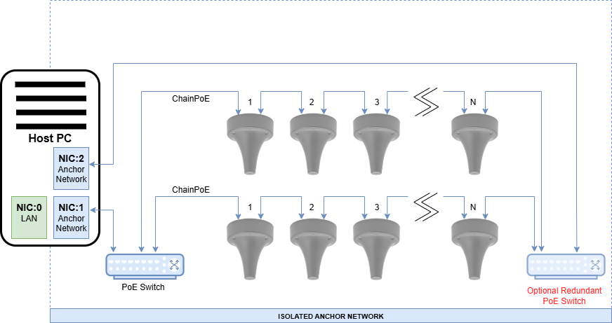 A chain of Anchors can be made redundant by connecting both ends of the chain to PoE switch ports. In a redundant topology, the system maintains power and communication continuity in the event of an intermediate anchor or cable failure. Functional anchors on either side of the fault will continue to operate without manual intervention.