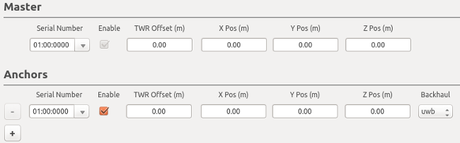 Setting up a system to use TWR mode takes less preparation than a system that will be used with RTLS. Any device that is configured as a Master or an Anchor with UWB based backhaul can two way range (TWR) with another device configured as a Master or Anchor with UWB based backhual. To setup an environment for TWR, fill in the serial numbers of the hardware in the serial number column.