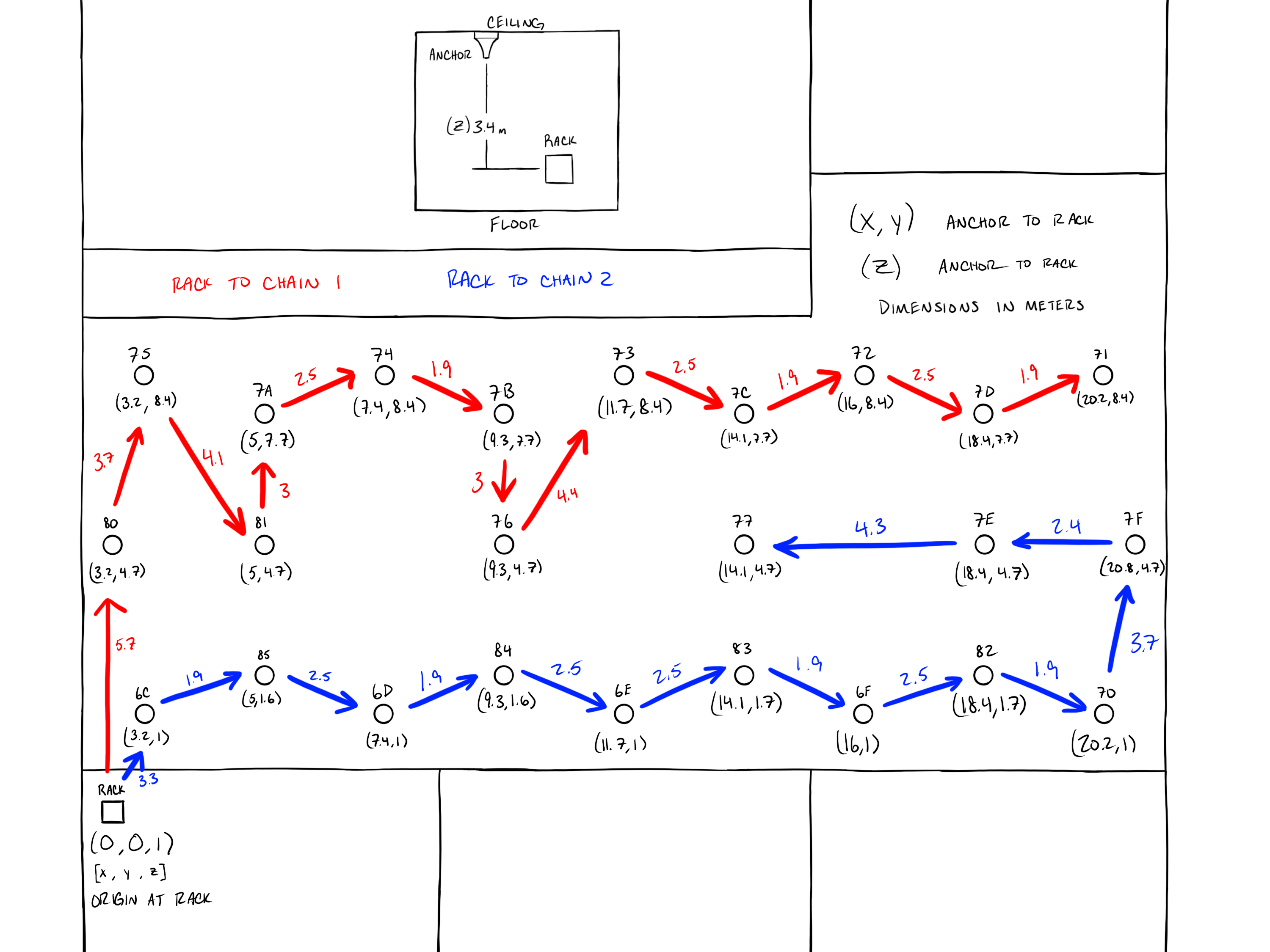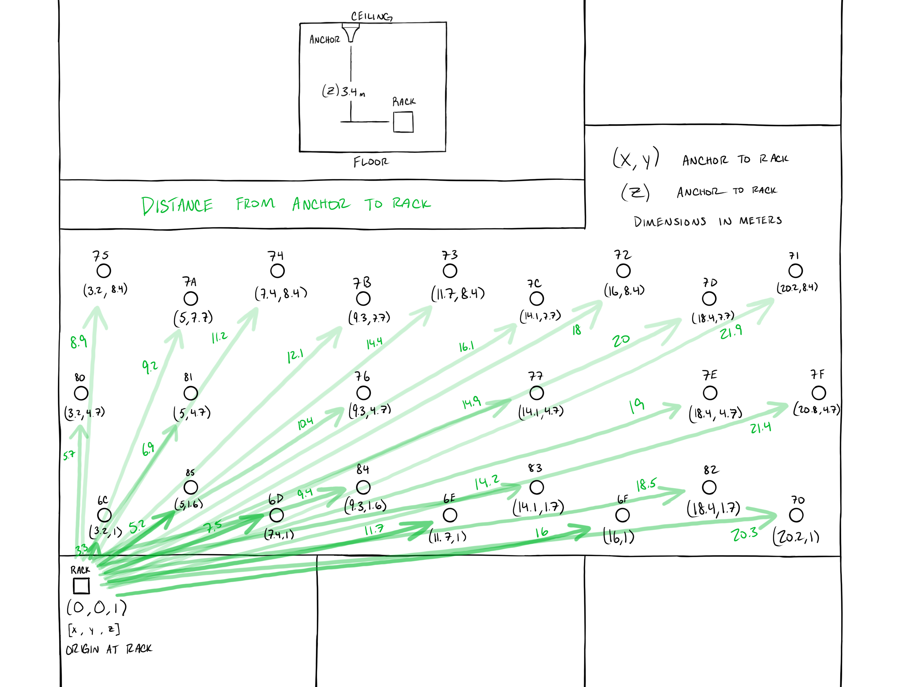 and are (0,0) of the PoE Switch. Added to each distance is a height of 3.4 meters to account for the cable running from the ceiling to the PoE Switch.
