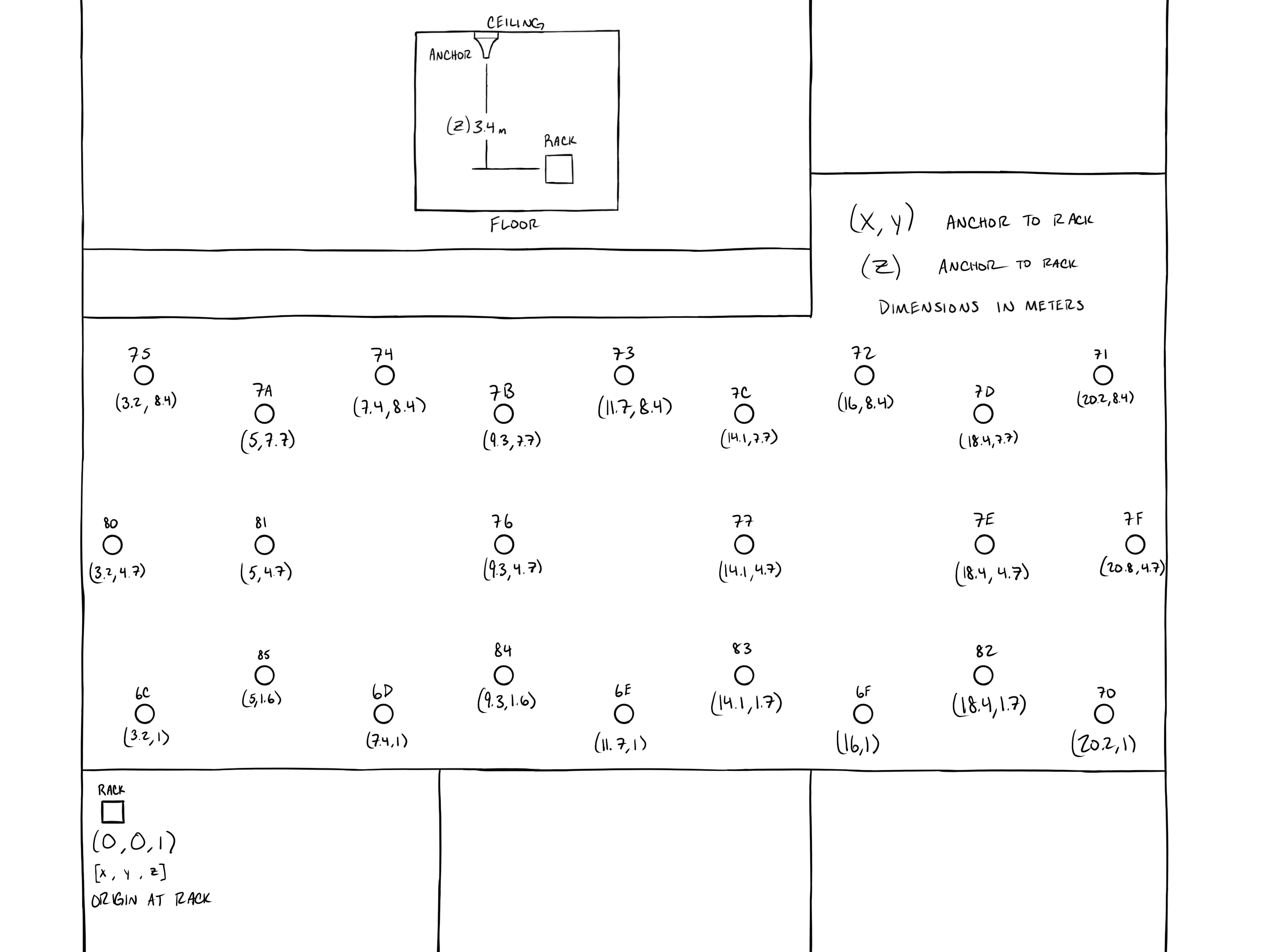 In Figure 1 below, the coordinates for each Anchor position are shown. Anchors were surveyed using a Total Station, and the resulting distances are reported in meters. For practical installation planning, Ciholas shifted the survey origin to the location of the PoE switch in the server rack. This adjustment allows for accurate cable length calculations directly from the rack to each Anchor.
