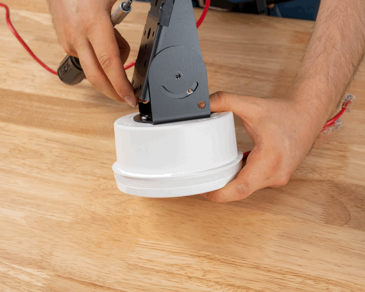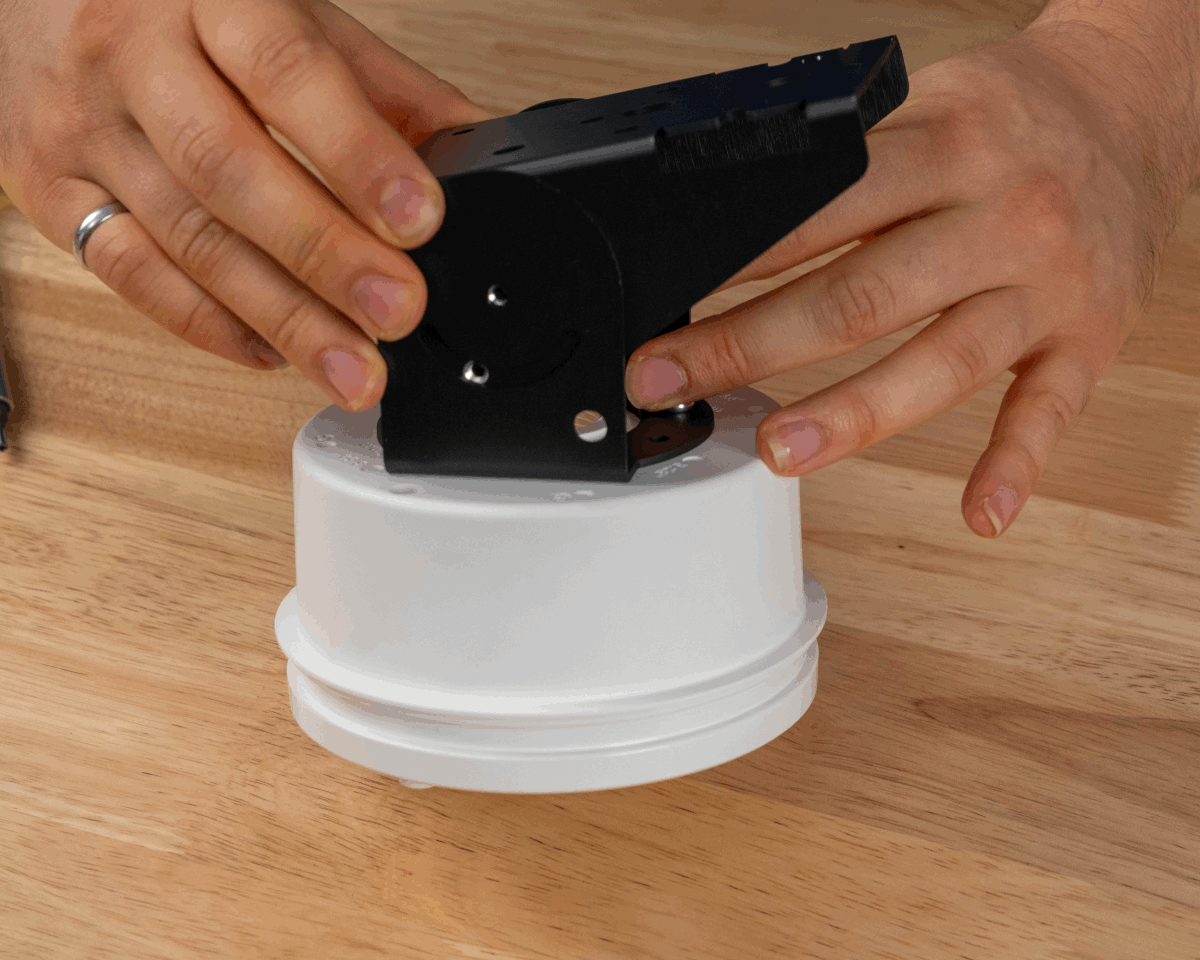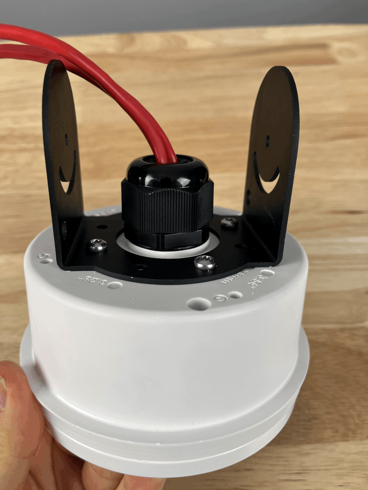 Screw the end of the cable gland to the AH302 Box Mount. Fully seat the flat rubber gasket onto the plastic and tighten to create a seal.