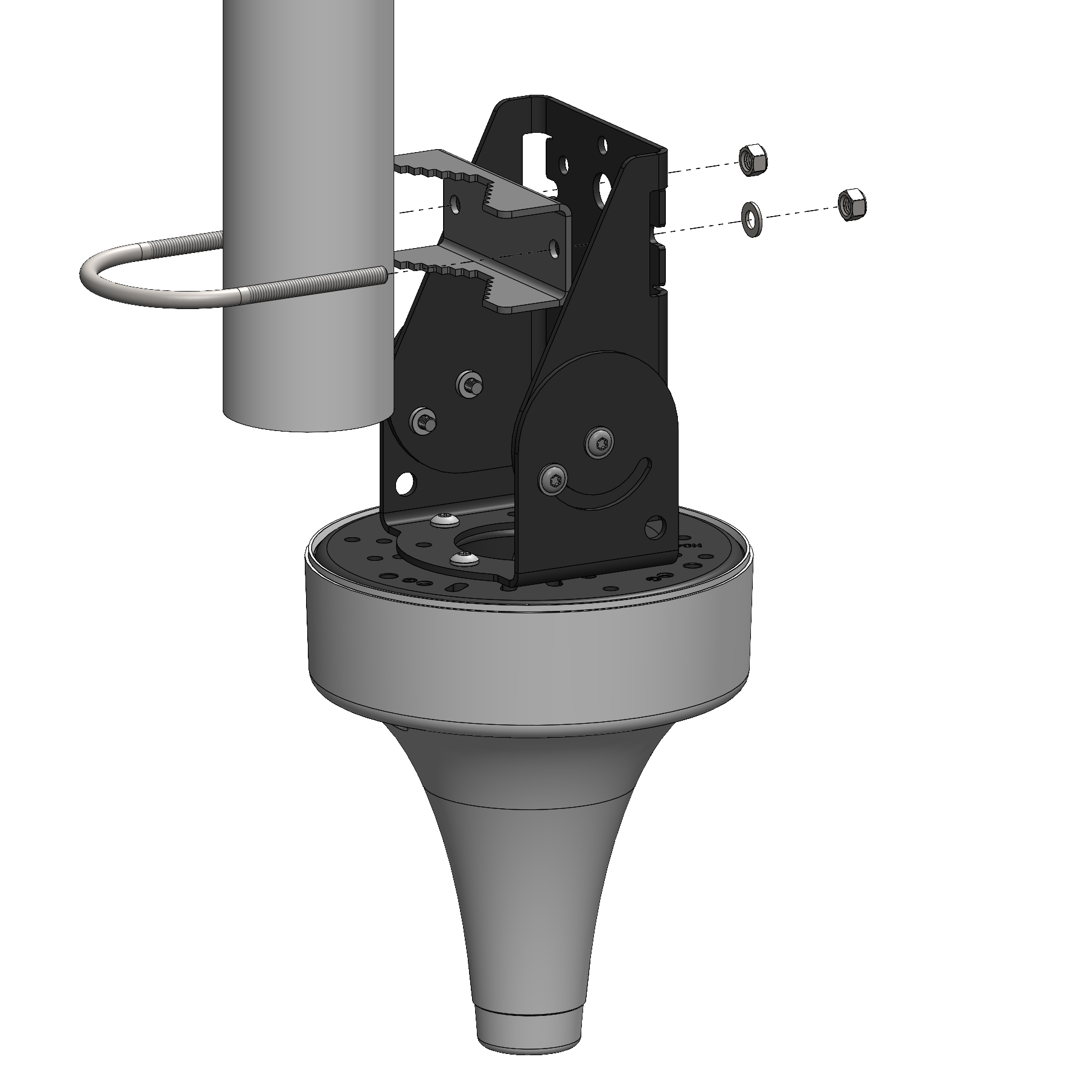 On backside of assembly, place washers then the lock nuts on U-bolt threads. Tighten the lock nuts.