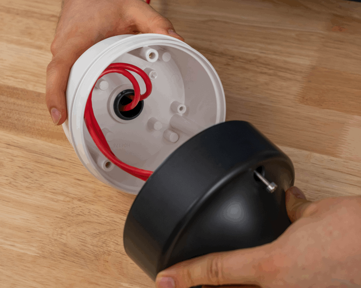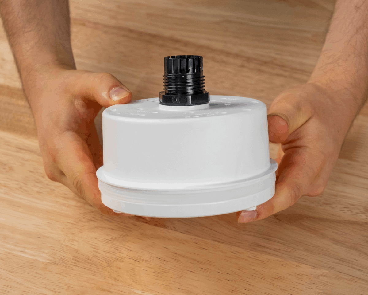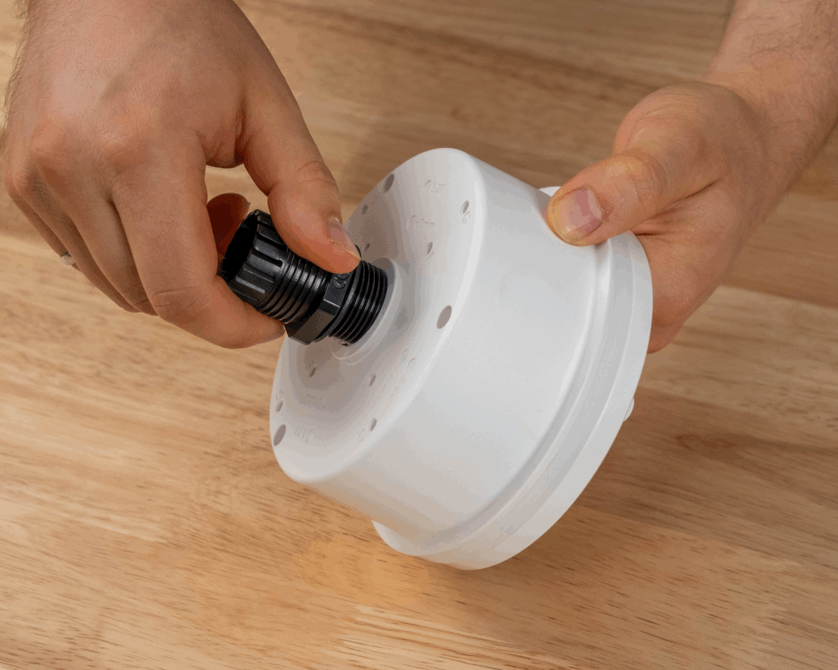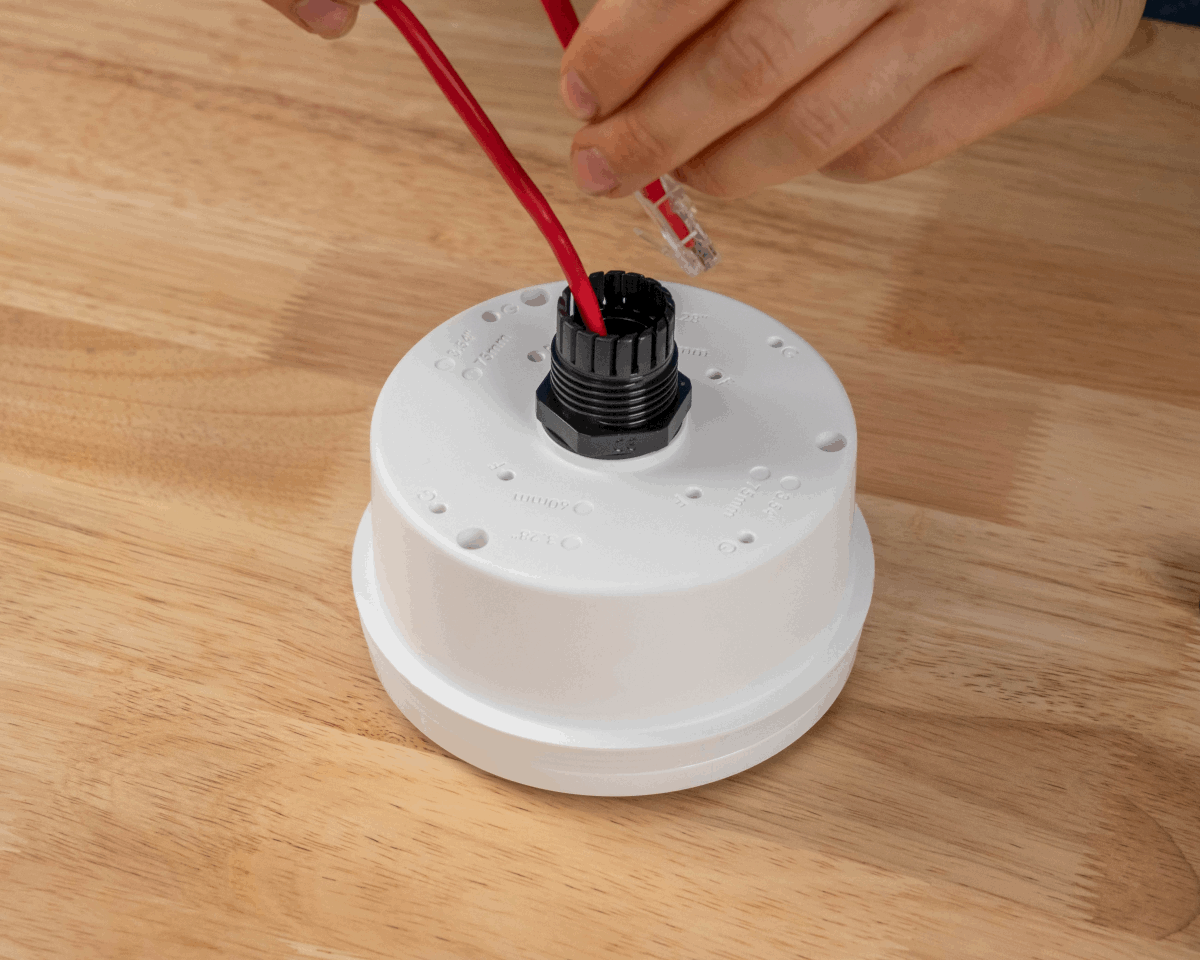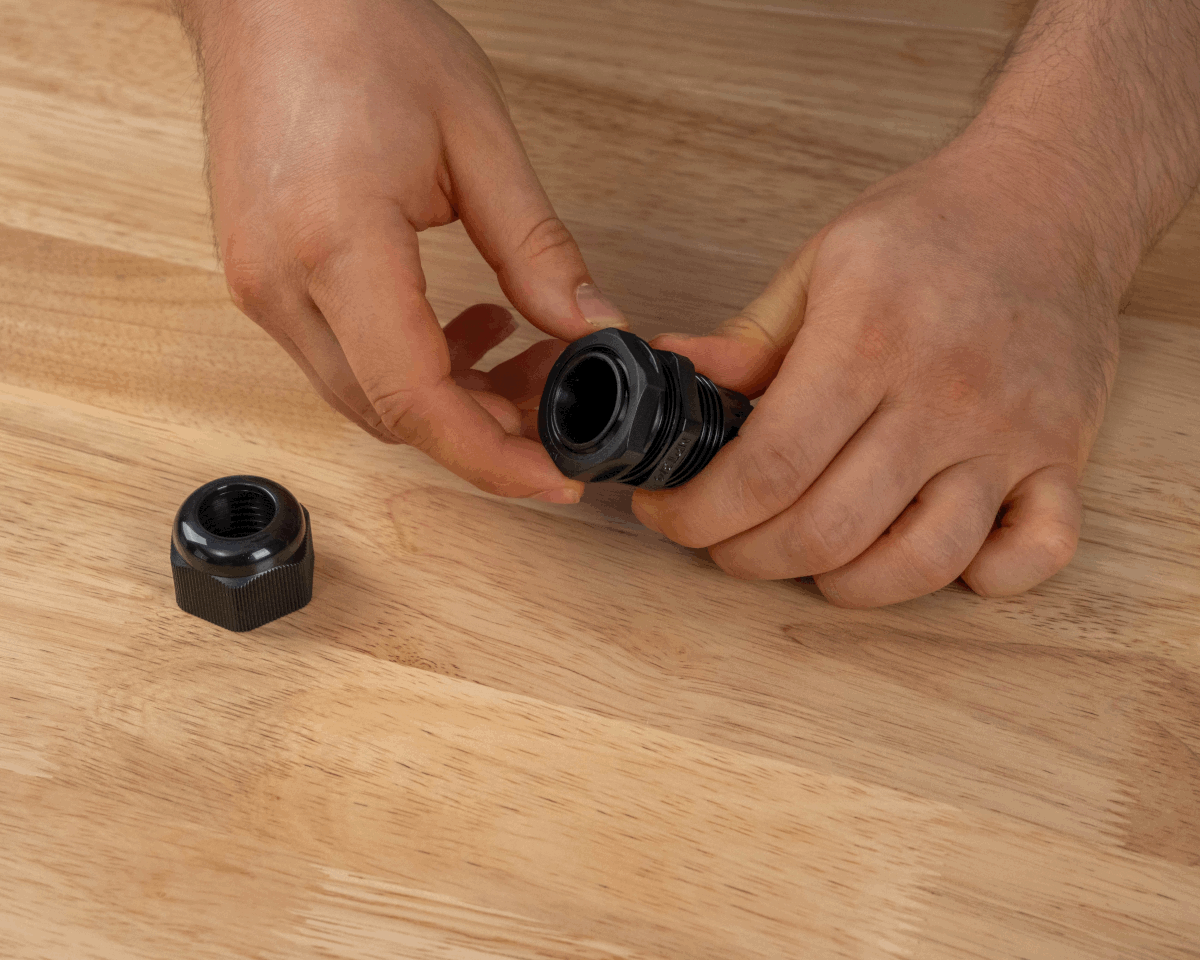 Screw the end of the cable gland to the AH302 Box Mount. Fully seat the flat rubber gasket onto the plastic and tighten to create a seal.