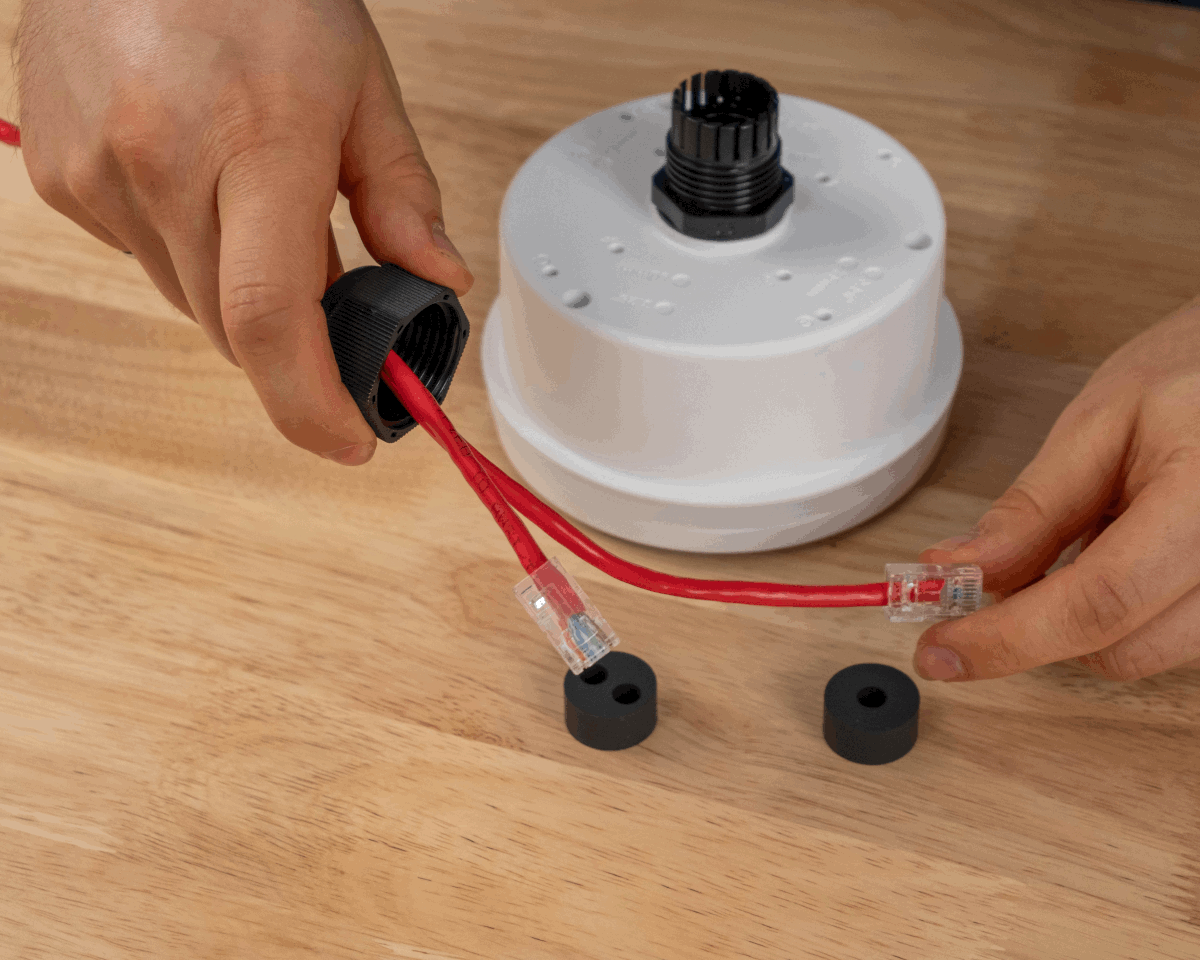 Select either the Single cable insert or the dual cable insert for the cable gland. Insert the Ethernet cable(s) through the slit(s) in the seal. The ring of silicon of the seal should face away from the cap nut.
