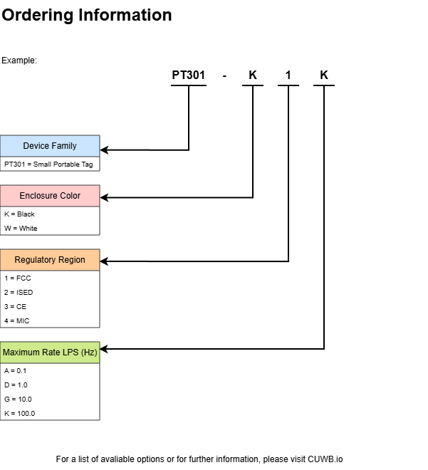 The PT301 maximum beacon rate is specified for each selected model. PT301 devices can be configured to beacon at any frequency up-to and including the maximum rate. The PT301 is region-locked at purchase to ensure compliance with local regulatory requirements. See regulatory compliance for supported regions and compliance statements.