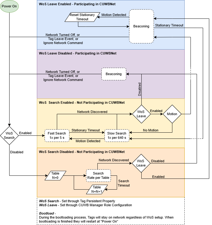 Wake-on-Shake (WoS), for CUWB devices, is a combination of two different settings: Wake-on-Shake CUWBNet Search and Wake-on-Shake CUWBNet Leave. Below is a flow chart outlining the various state interactions.